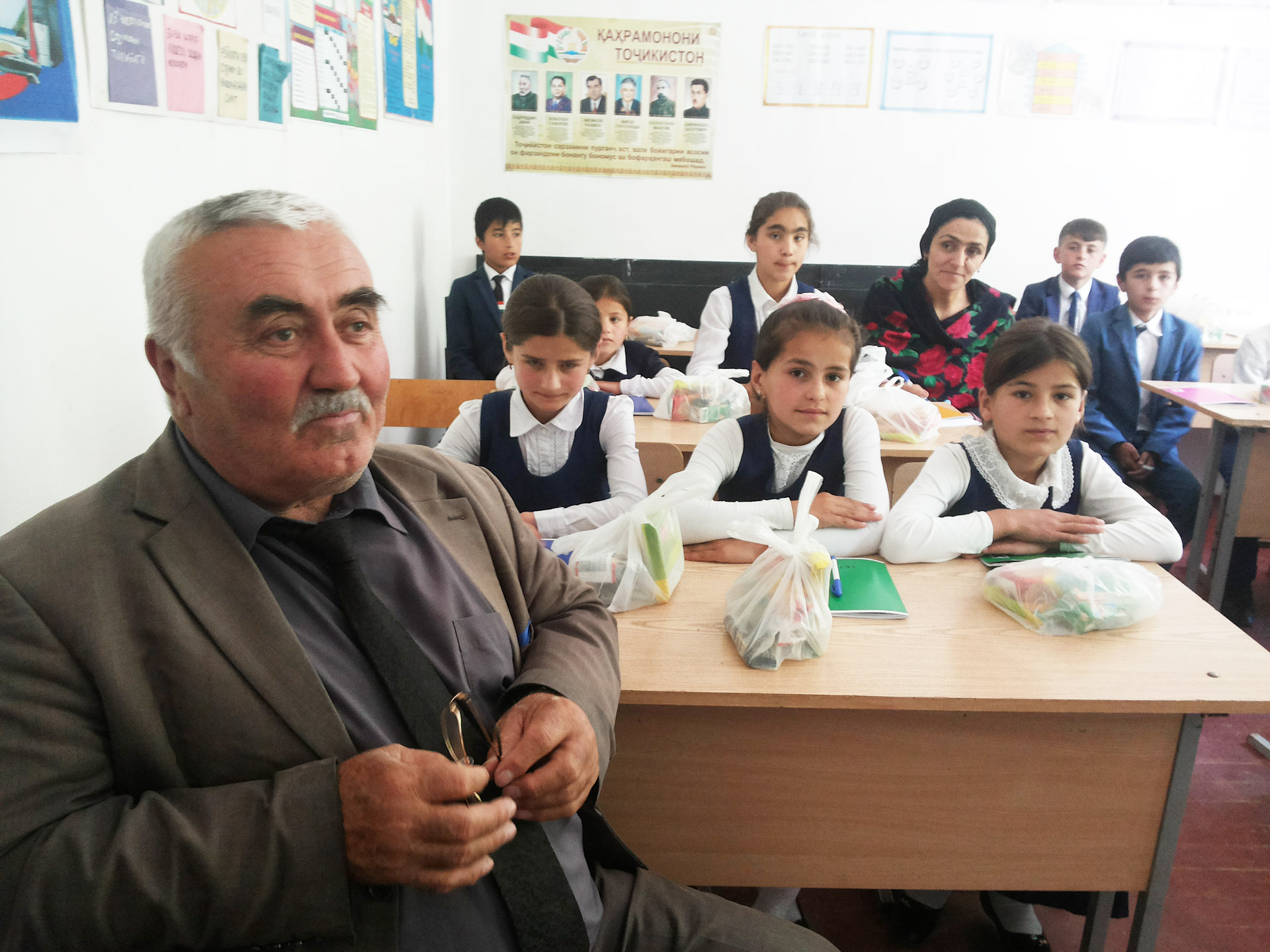 The school’s inspector Vazirov Pirmahmad welcomes the new school, which has also saved parents money on shoes: