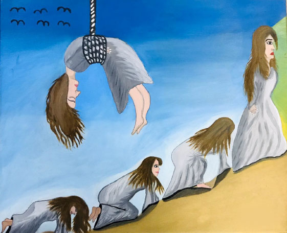 ”Malerierne udtrykker vold og mangel på kontrol over egen krop. Jeg ser afmagt. Kvinderne er afkræftede, udmattede, magtesløse. Præcis som jeg oplever det hos mine klienter.”