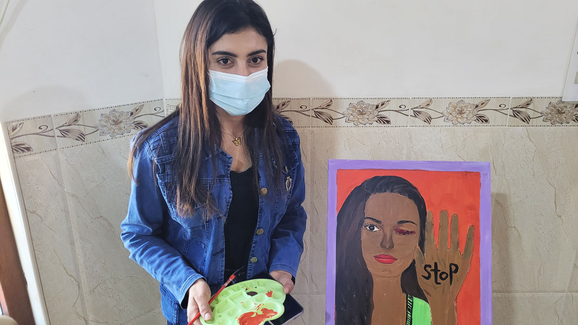 Rehma er i gang med at male en ung kvinde, hvis ene øje er såret, men som alligevel strækker armen frem med et STOP skrevet i håndfladen. På Mission Østs medborgercenter i Sinjar lærer hun at bearbejde sin sorg ved at male lige det, hun føler.